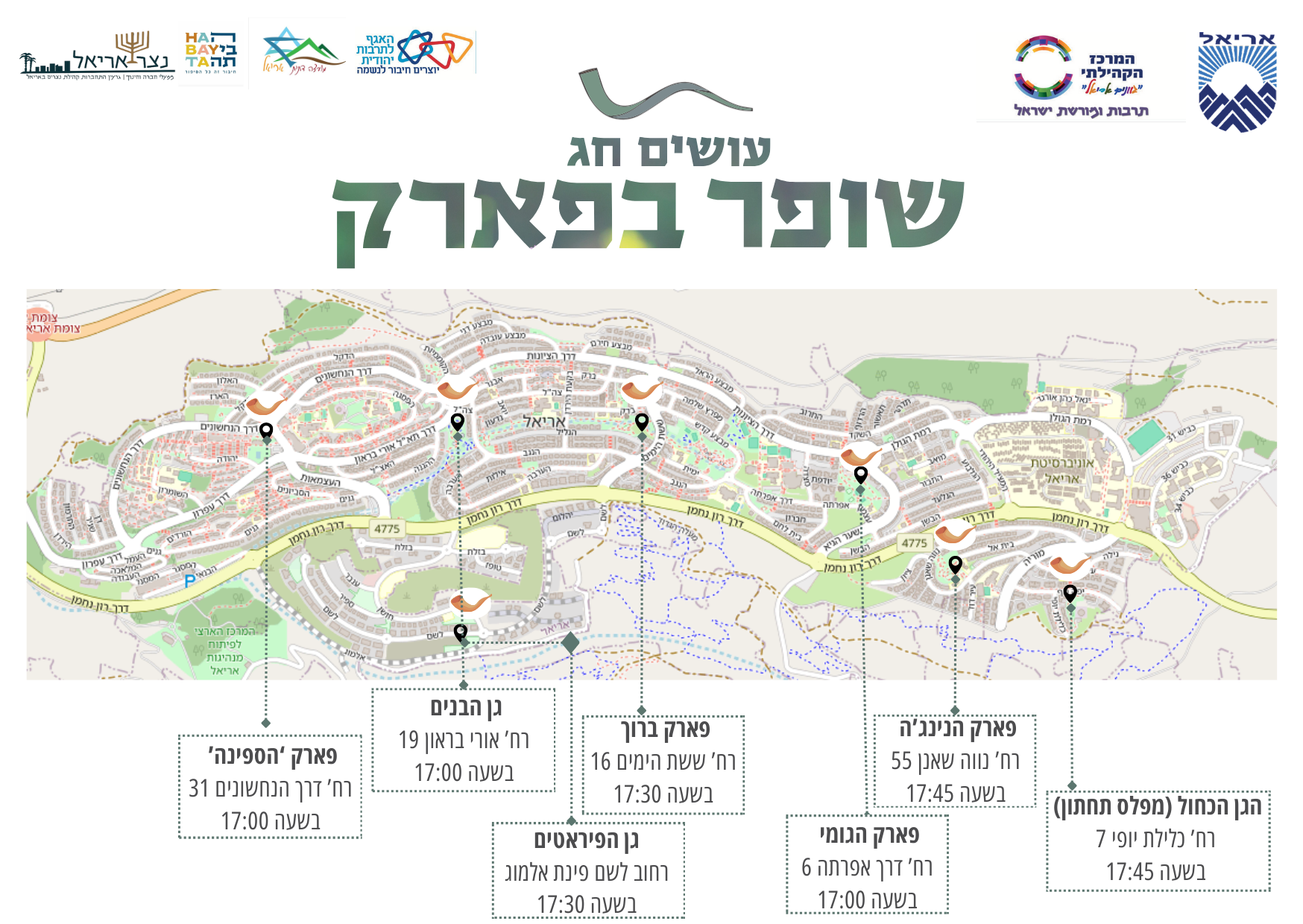 • גן הפיראטים - רח׳ לשם פינת אלמוג. יתקע בשופר: הרב צבי לרנר.